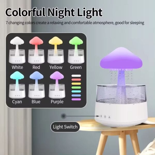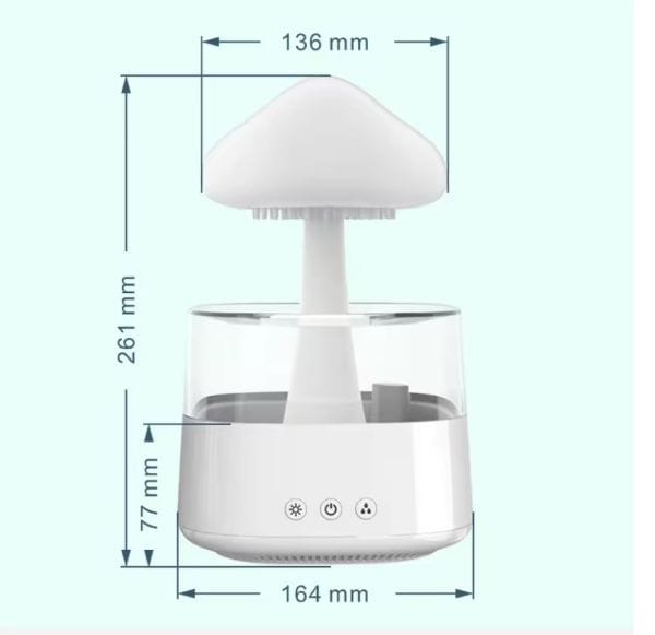 The mushroom desktop humidifier is a versatile and stylish 3-in-1 device that combines an LED color-changing night light, humidifier, and essential oil diffuser. This innovative device is designed with a unique raining cloud mushroom shape, emitting calming raindrop sounds to help you sleep better. With three different modes and three rain settings, you can customize your experience to create the perfect for relaxation or sleep. The 5-hour timer mode and anti-spill design ensure worry-free use throughout the night. Improve air quality with the humidifier function, removing odors and adding moisture to the air. Add your favorite essential oils to the diffuser for a personalized aromatherapy experience.  Powered by an energy-efficient type c to USB cable, this desktop humidifier is easy to set up and use. Enhance your home environment and promote relaxation with this versatile and stylish device.